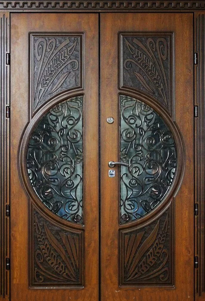 Поскольку в большинстве случаев устанавливаемые на входе в коттедж двустворчатые двери являются еще и предметом интерьера, украшающим здание, их дизайну предается особое значение. Эти двери, как правило, отделываются атмосферостойким МДФ, натуральным шпоном, массивом. Эффектно на таких дверях смотрится витражный узор, применение ковки, зеркальных элементов. Вариантов декора входной двустворчатой двери масса, тут все зависит от пожеланий заказчика.