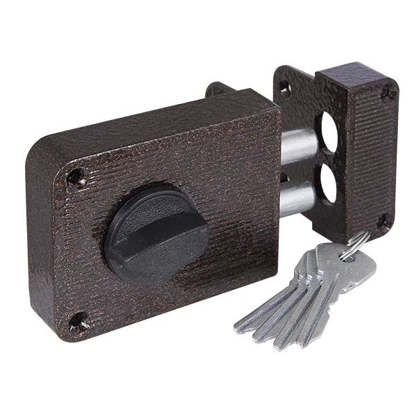 Замок накладной ЗН 1-3 предназначен для деревянных и металлических дверей. Корпус замка выполнен из цинкового сплава, ригели из стали. Имеется блокировка открывания двери ключом снаружи. Изнутри замок запирается ручкой. 2 класс секрета. Количество секретных комбинаций: 15 000. Два ригеля диаметром 14 мм. Цвет: медь. Комплектация: замок, цилиндровый механизм МЦ-1, 4 английских ключа, ответная планка, 1 накладка, крепежная фурнитура.